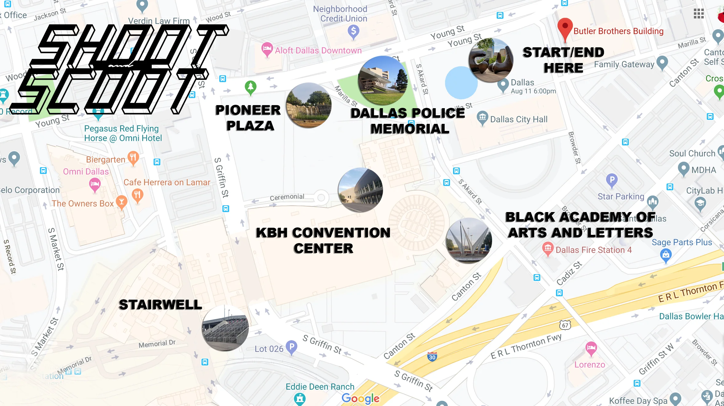 We will all start in the Dallas City Hall Courtyard shootin’ with Moxiee. After that, feel free to shoot at any location you want, in any order. Let’s meet back up at the starting place at 8:00pm so we can take a group photo!